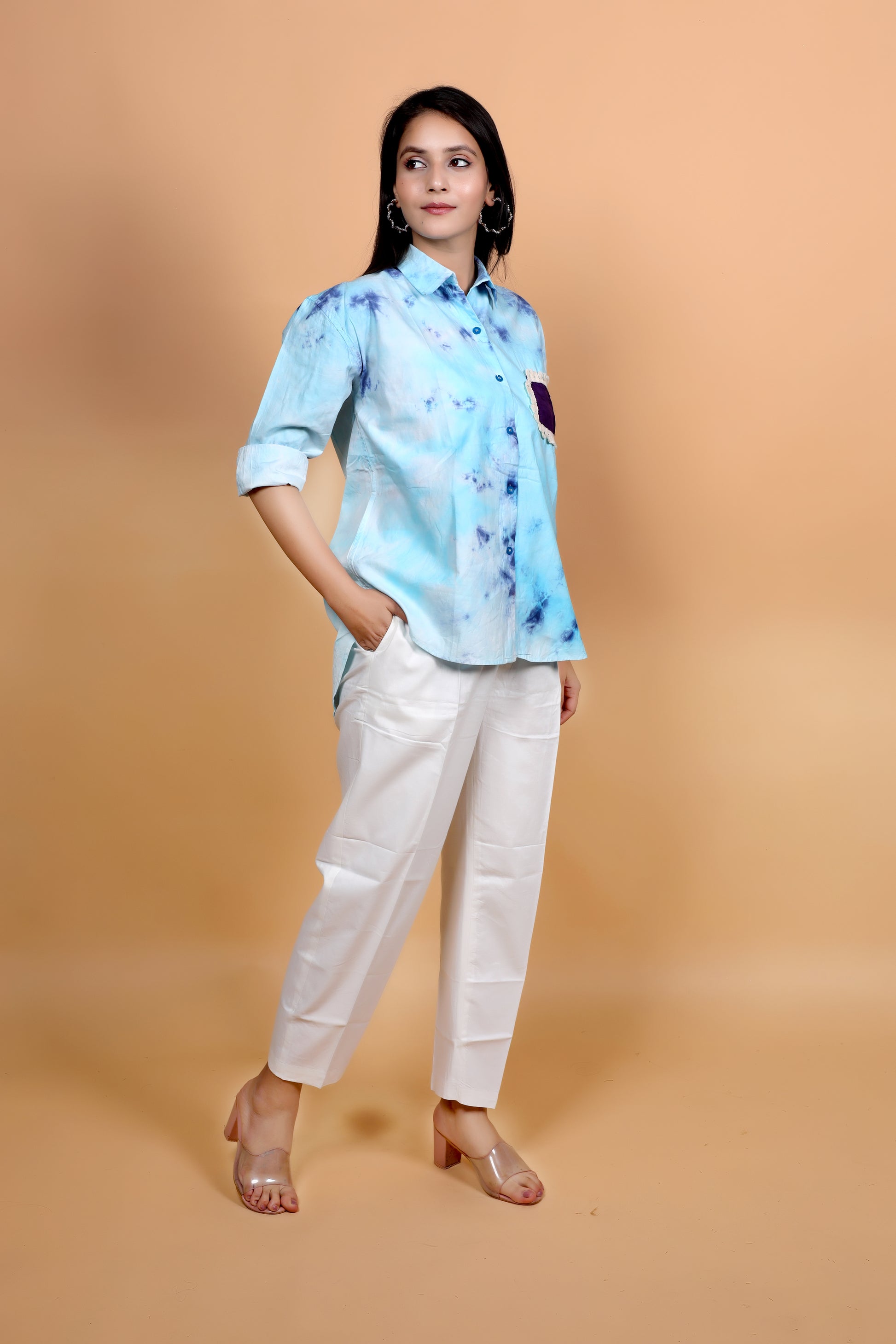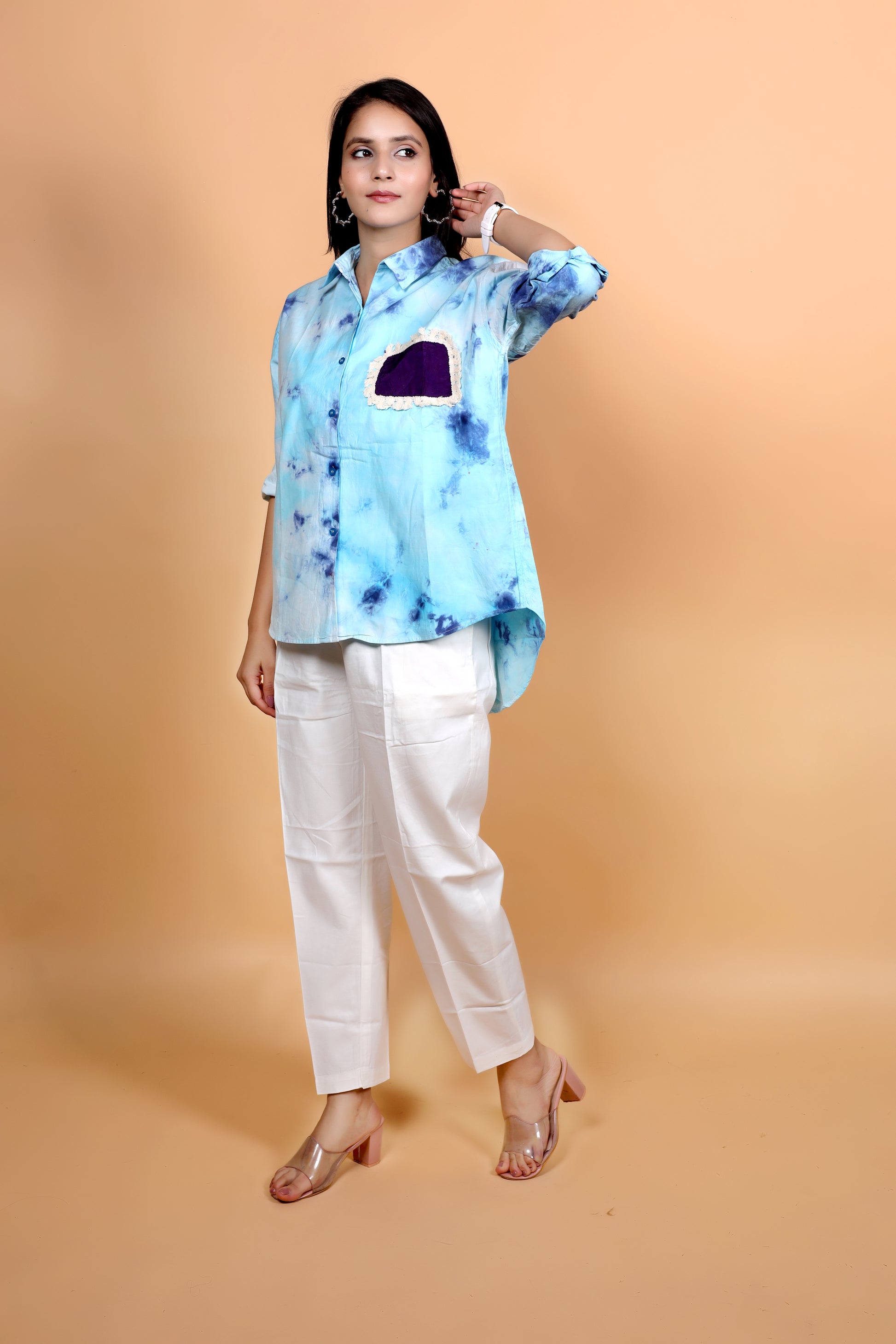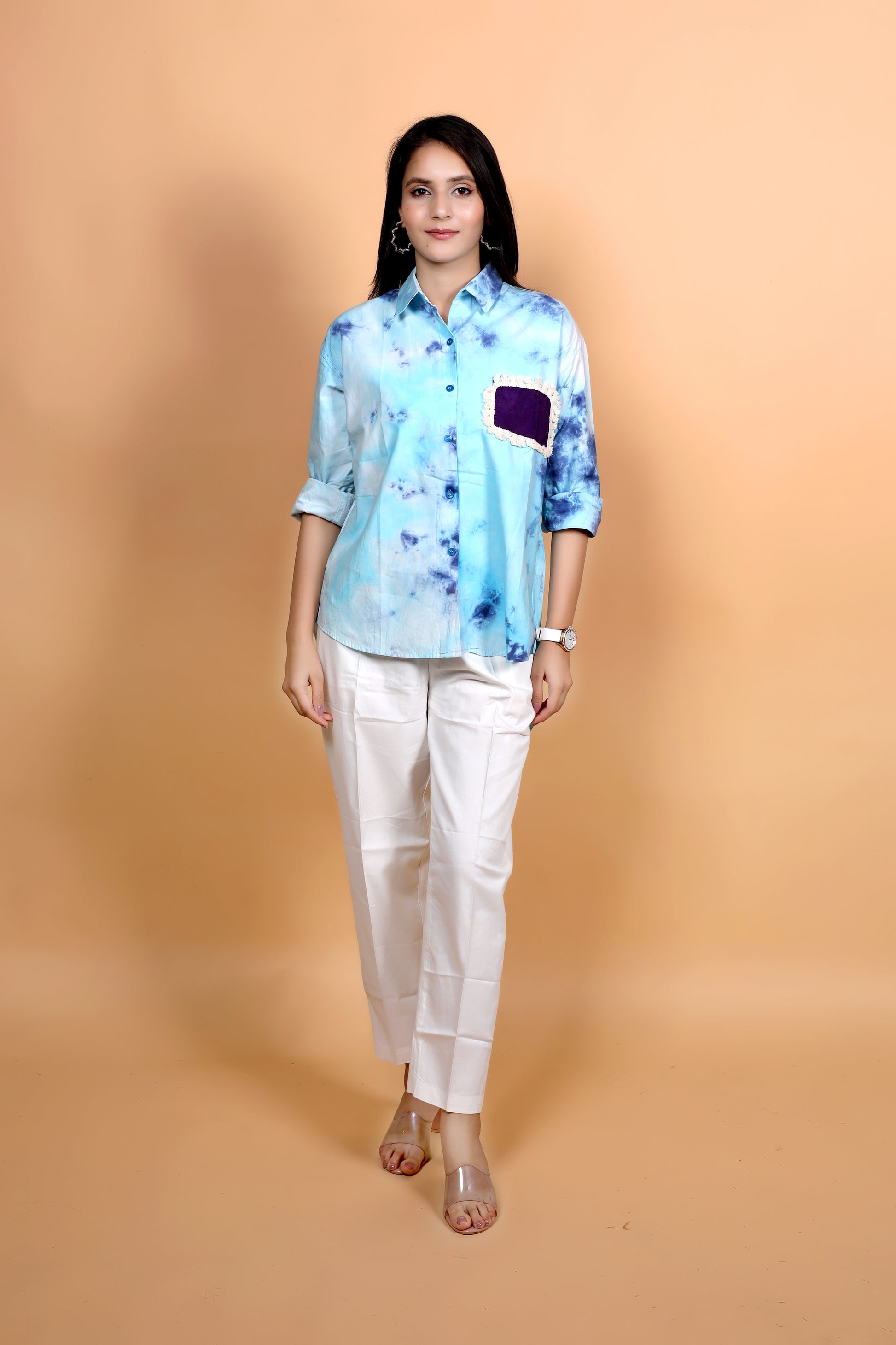 Infused with the calming tones of sky blue and deep indigo, this handcrafted tie-dye shirt is a modern expression of effortless style. The design is elevated with a statement patch pocket in rich purple, bordered with delicate detailing that adds a hint of contrast and character. Made from breathable cotton and tailored in a relaxed silhouette, it offers both comfort and versatility. Whether styled with crisp trousers for a refined look or paired with denim for casual charm, this shirt stands out as a unique piece – no two are ever alike, thanks to its artisanal dyeing process.