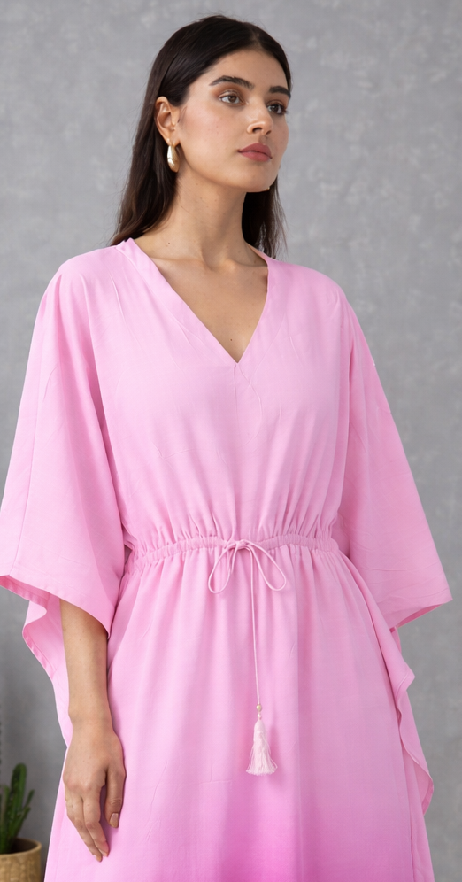 Soft, feminine, and effortlessly graceful, this ombre kaftan flows from delicate blush pink to a rich berry hue. Designed with a relaxed silhouette, airy wide sleeves, and an adjustable drawstring waist with tassel details, it offers the perfect balance of comfort and elegance. Ideal for brunches, vacations, festive gatherings, or easy evening wear, this maxi dress brings a fresh pop of color to your wardrobe while keeping it light and breezy.