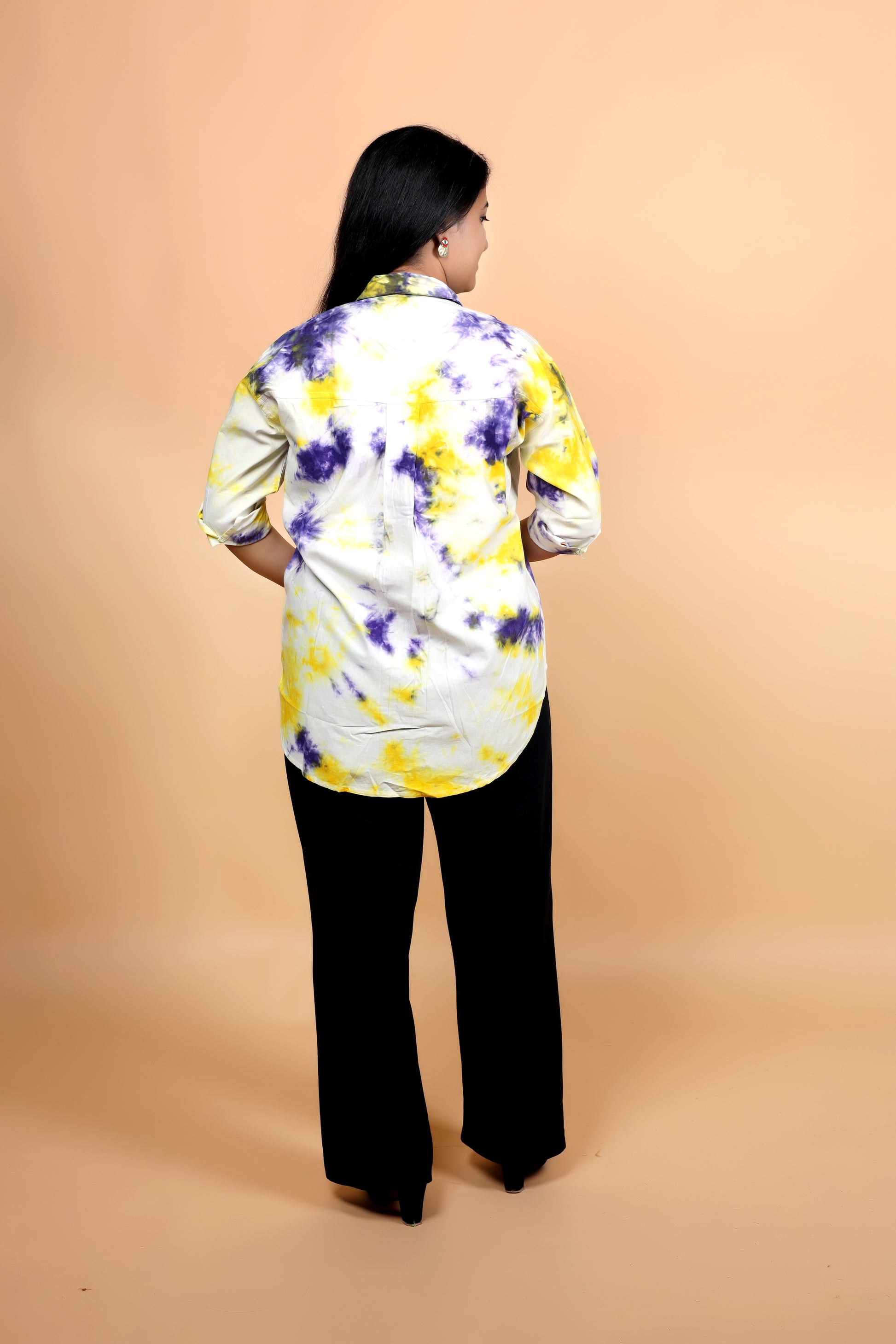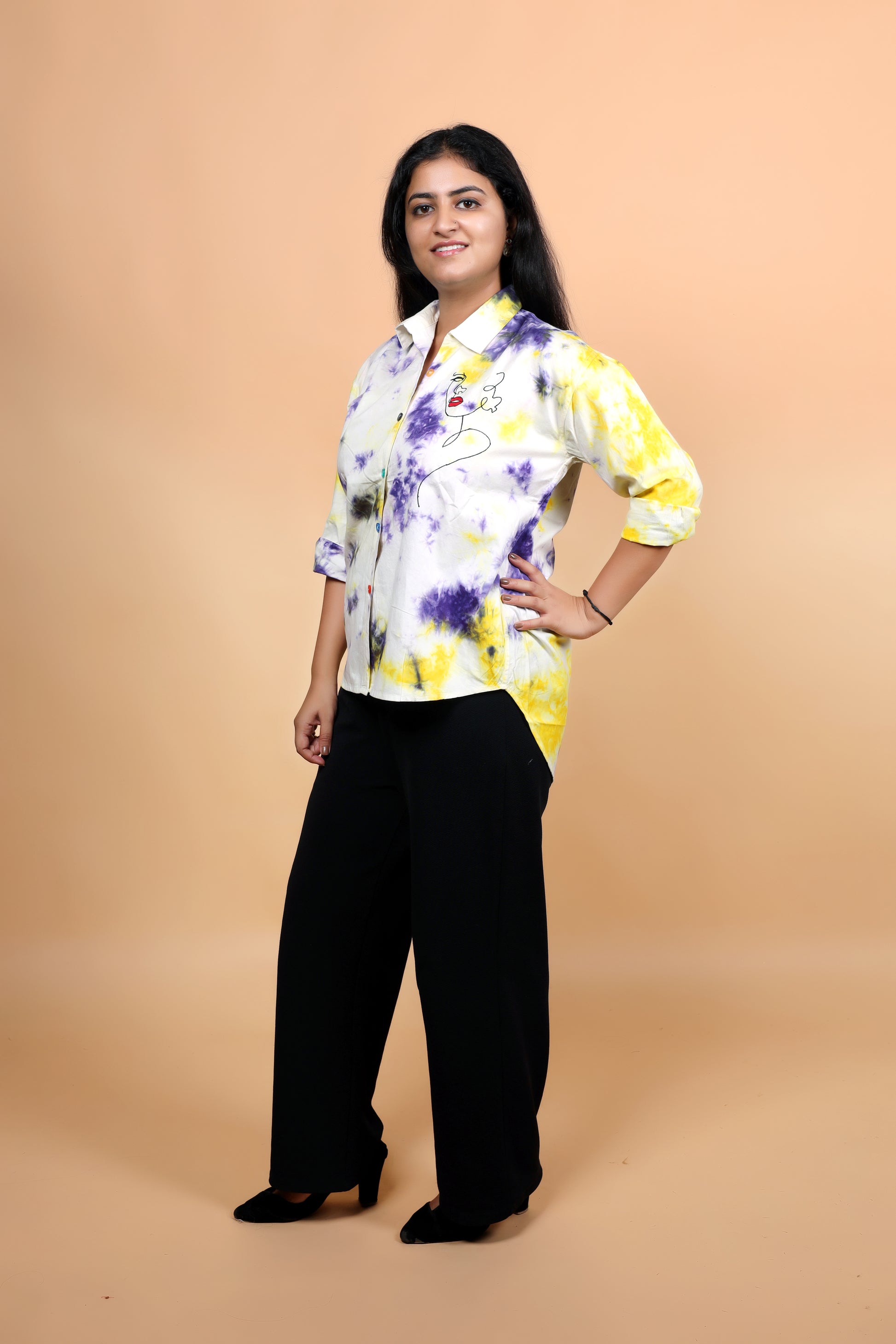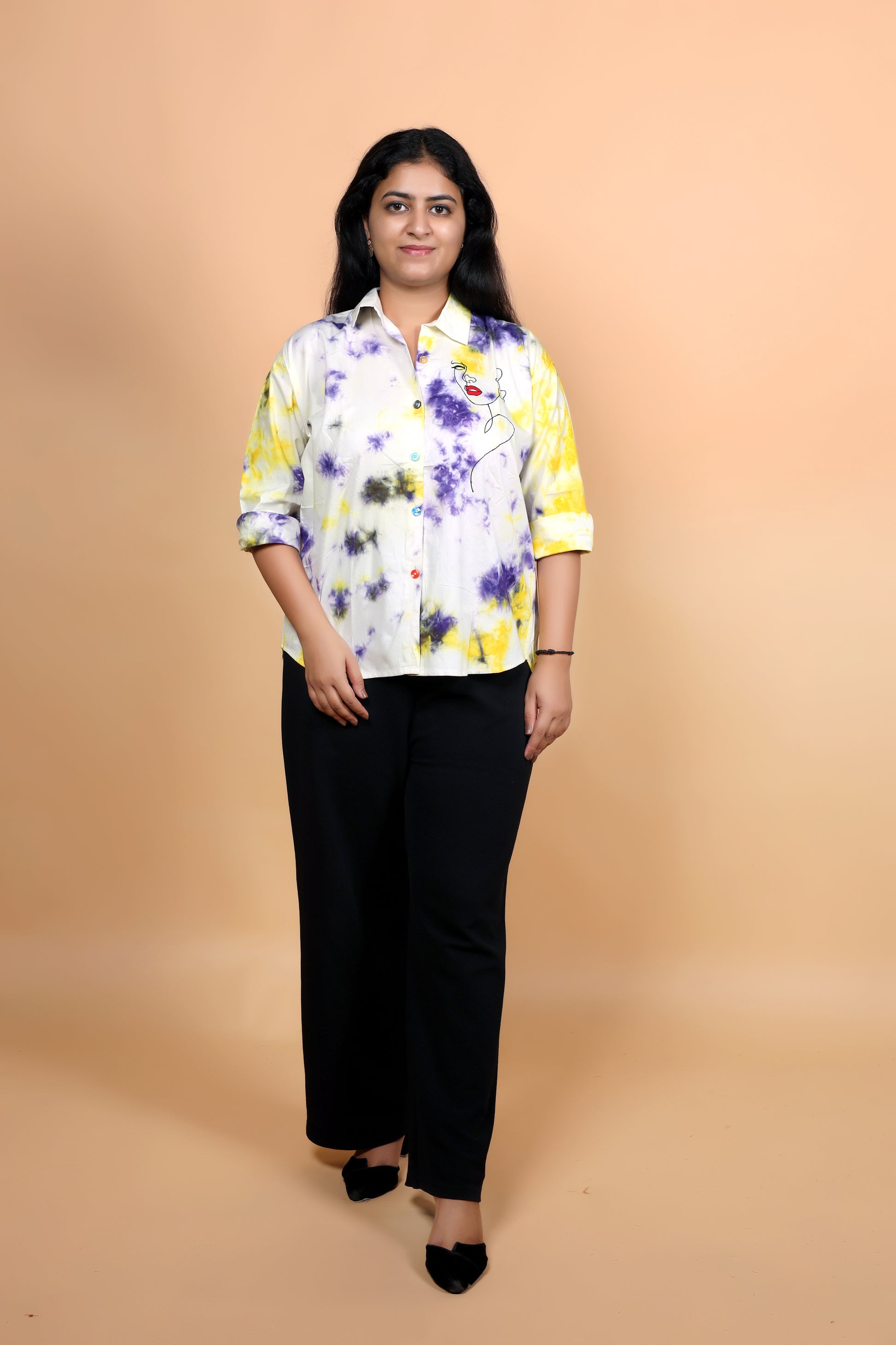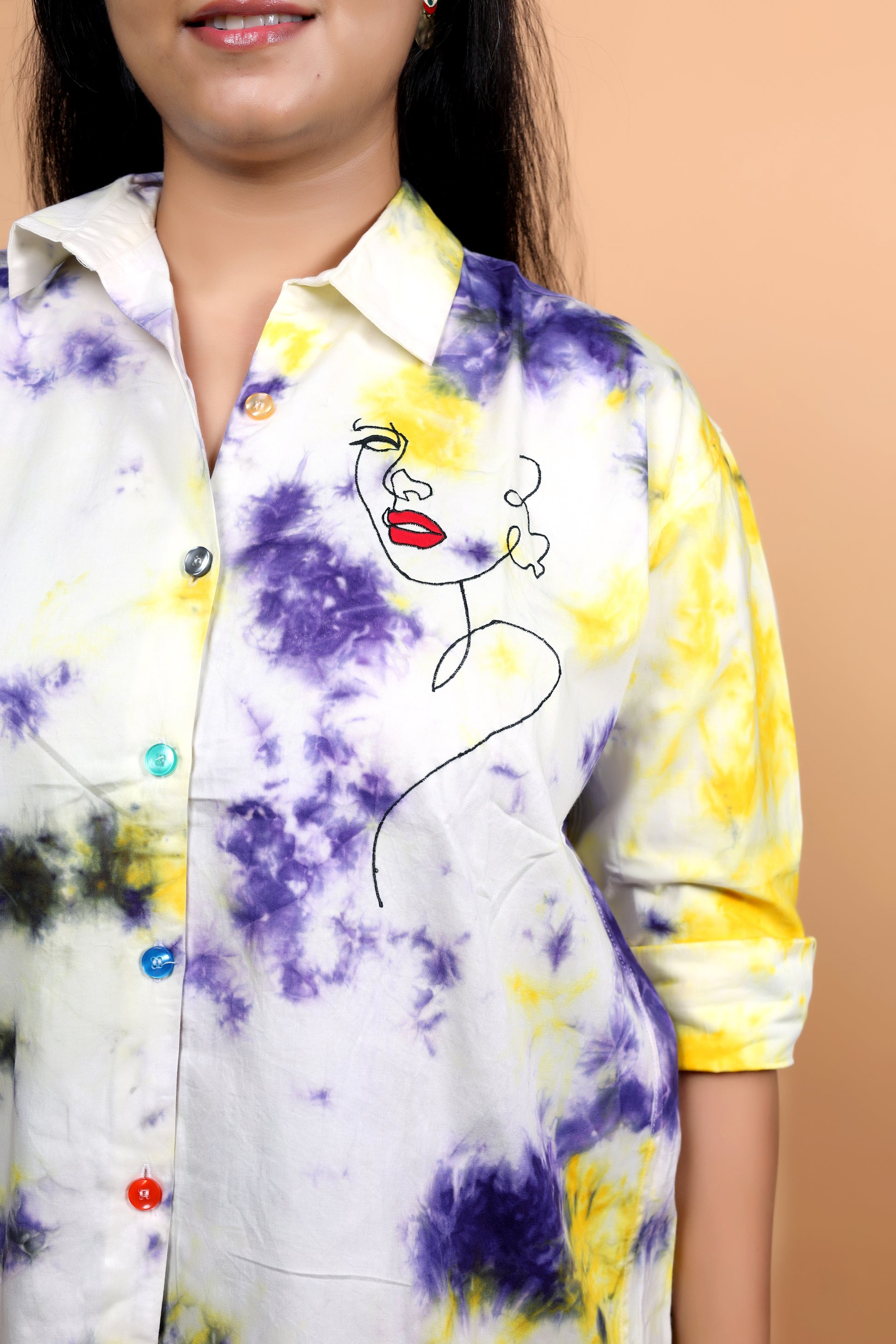 Bright, artistic, and effortlessly stylish, this handcrafted tie-dye shirt combines bursts of sunshine yellow with deep purple accents on a soft ivory base. The look is further elevated with a contemporary line-art embroidery on the chest, adding a unique design element that makes it stand out. Made from breathable cotton and finished in a relaxed silhouette, it ensures comfort while making a statement. Perfect for casual outings or styled up for a chic evening look, each piece is individually hand-dyed, celebrating craftsmanship and uniqueness in every detail.