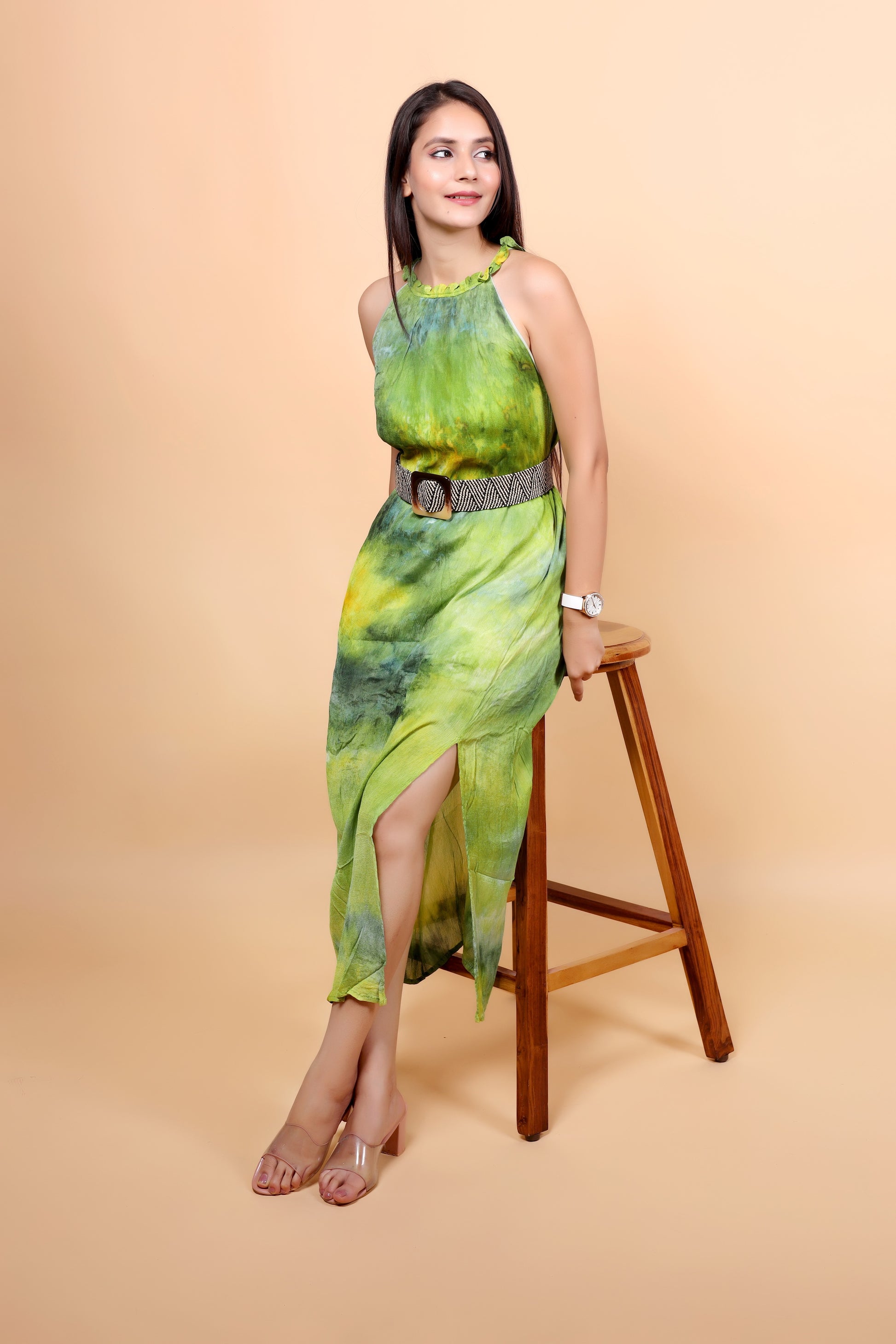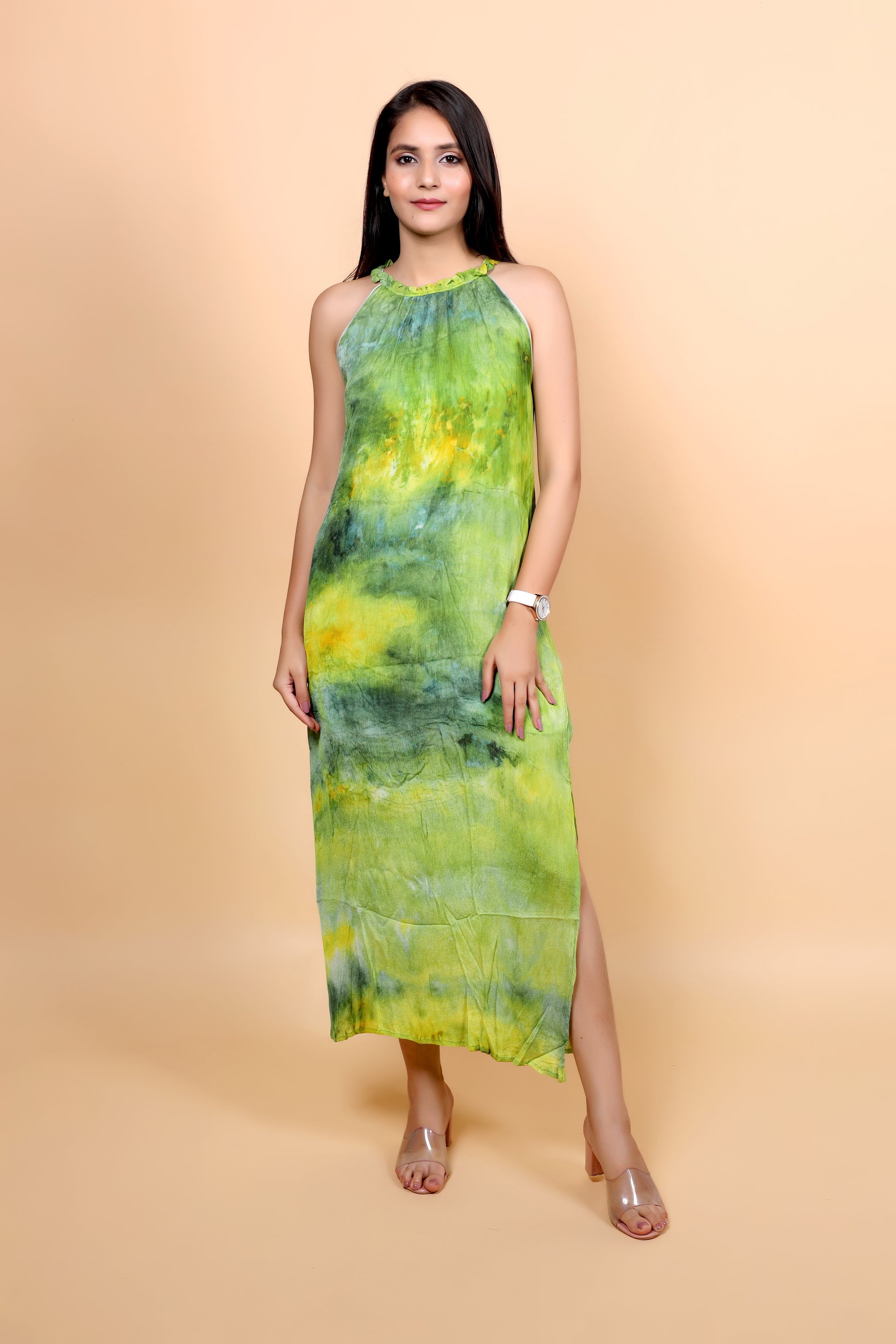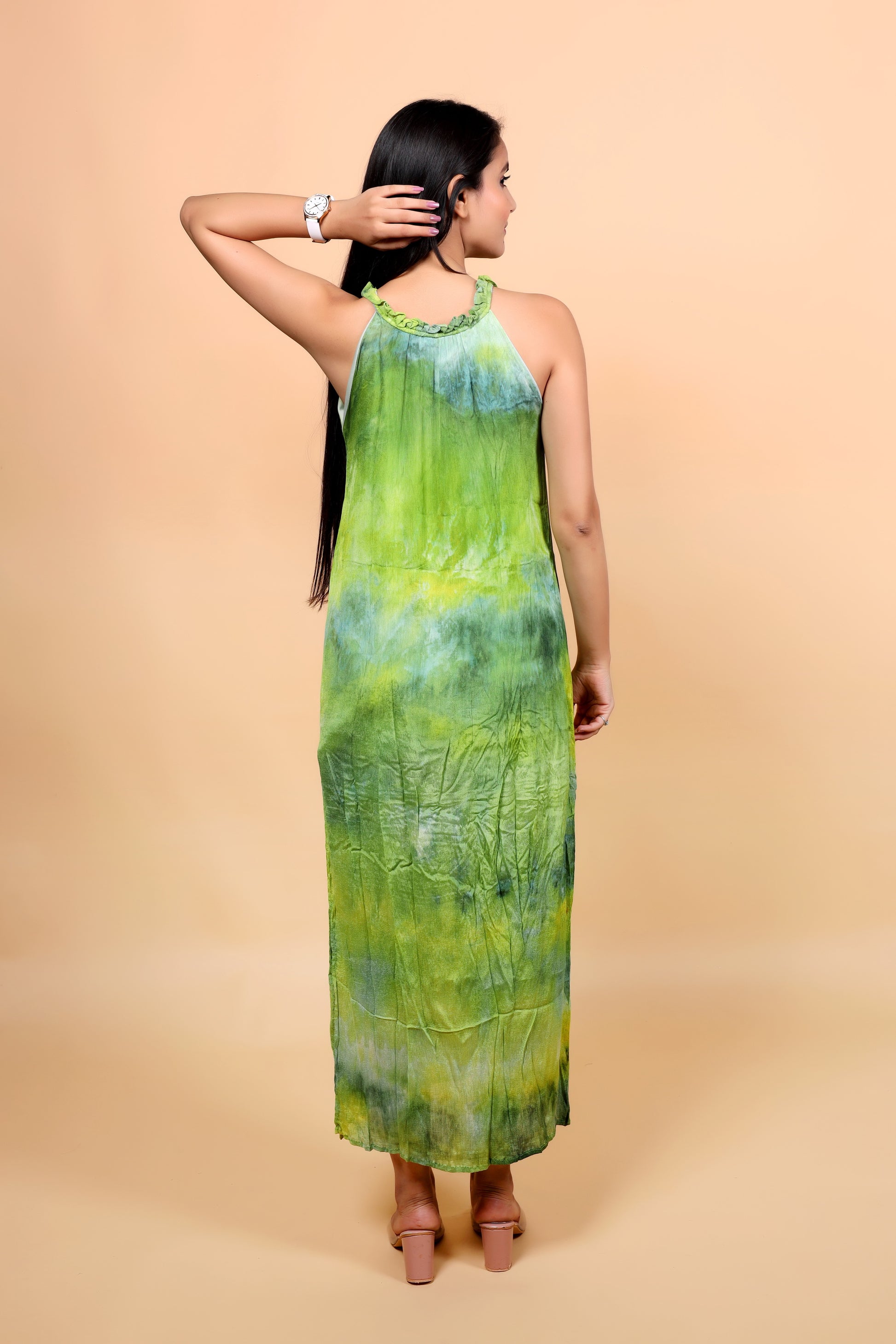 Bring freshness and charm to your wardrobe with this hand-dyed maxi dress, created using the artistic ice dye technique that gives every piece its own unique color story. Blending deep green, soft leafy tones, and sunny yellow, the dress reflects the beauty of a blooming forest kissed by sunlight.