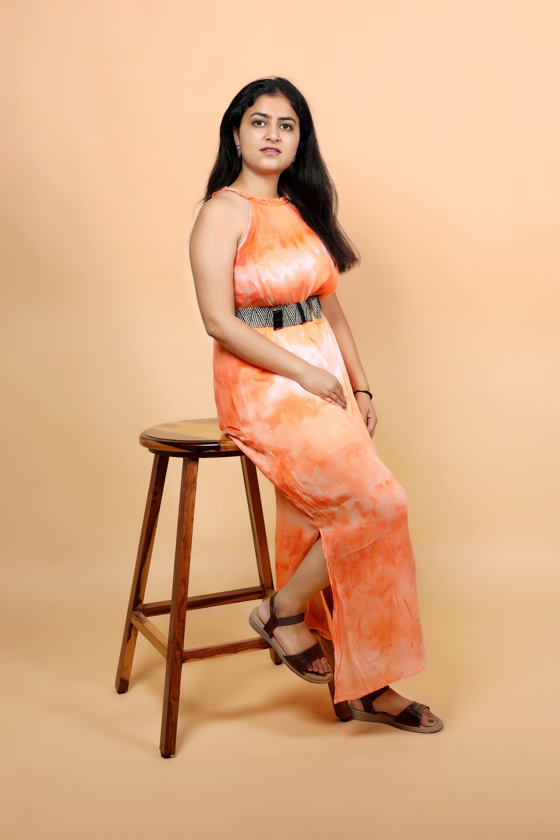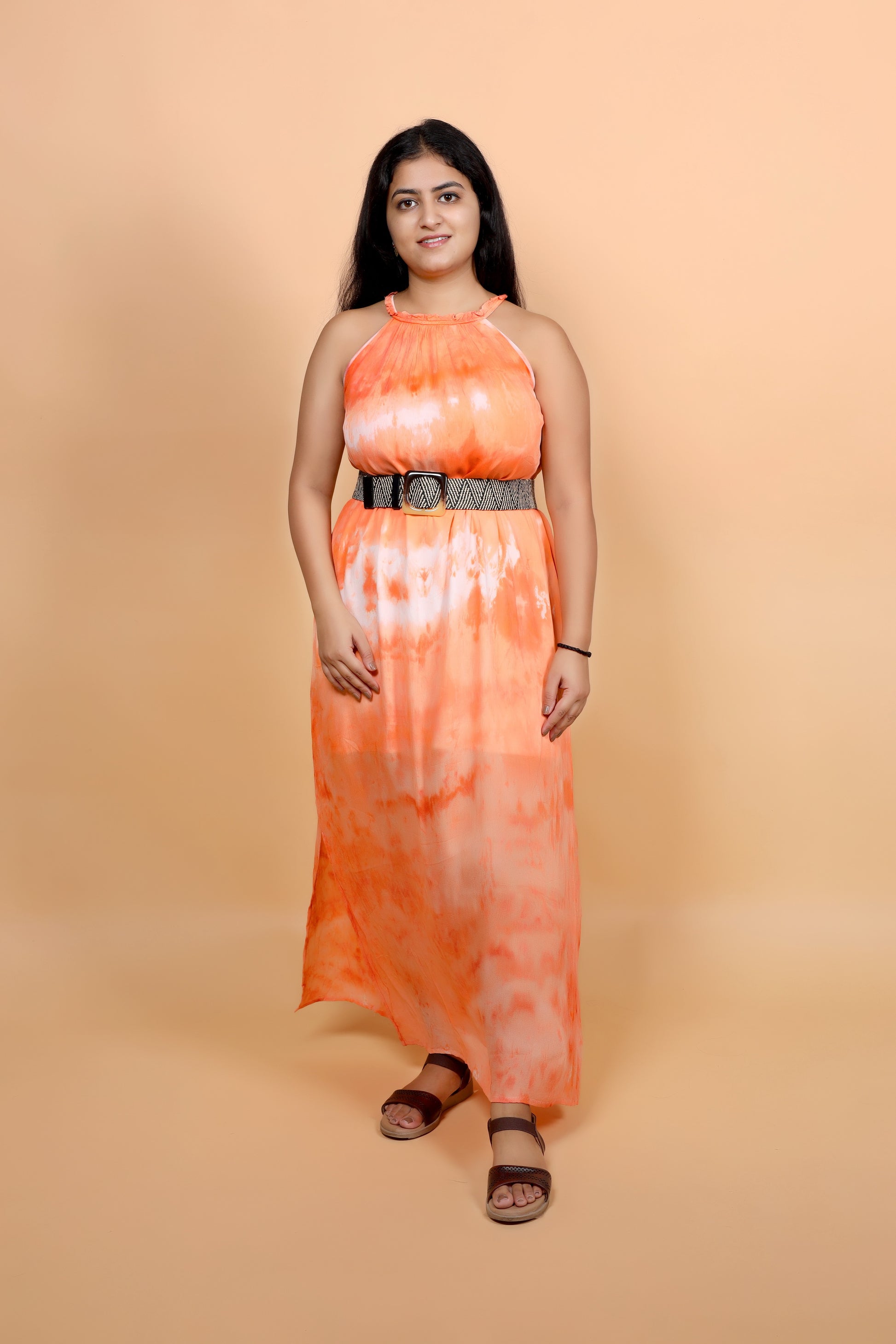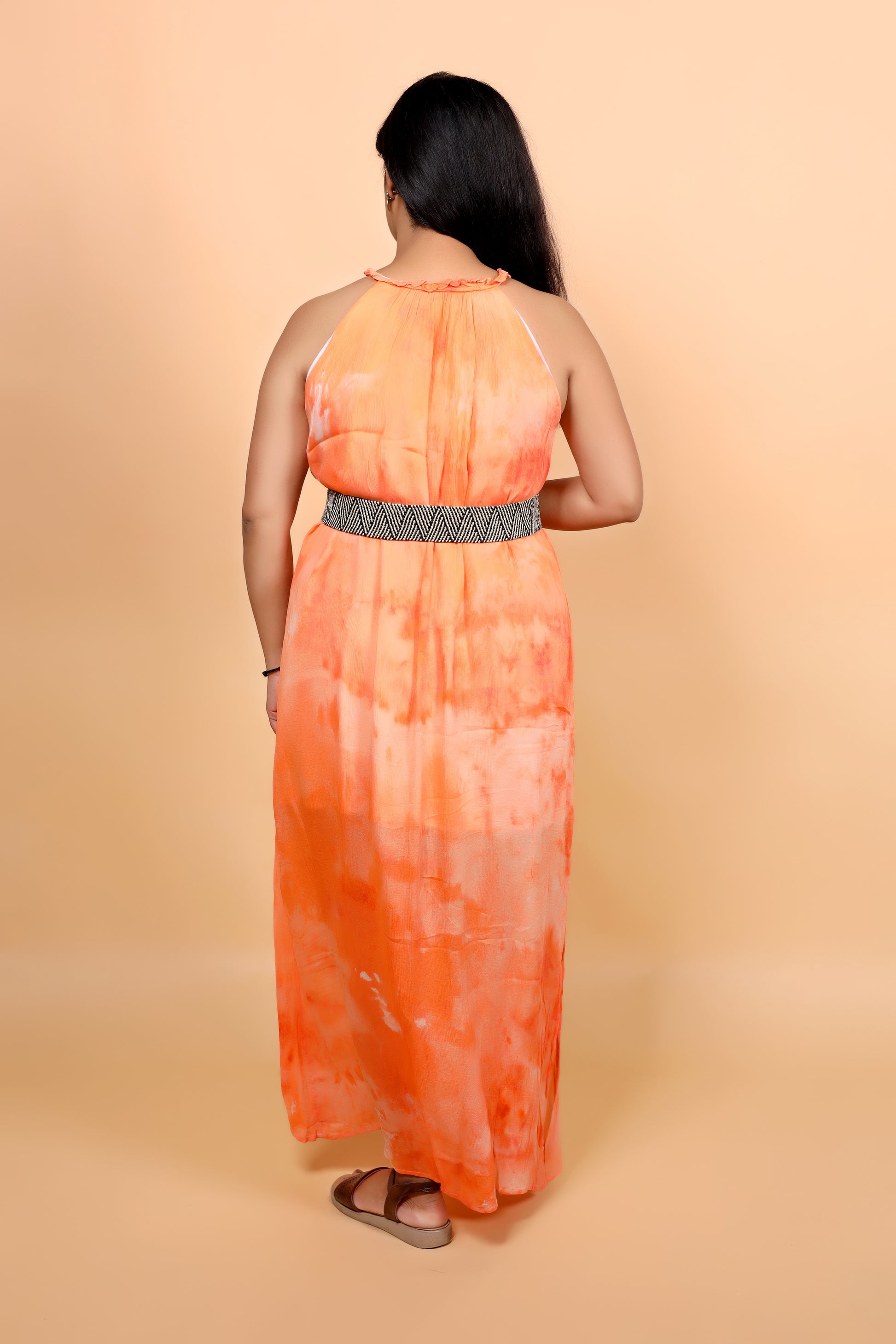 Turn heads with this vibrant hand-dyed maxi dress, crafted using the unique ice dye technique that creates one-of-a-kind color patterns. Featuring shades of fiery orange and soft peach with hints of white, this dress beautifully captures the warmth of a glowing sunset.