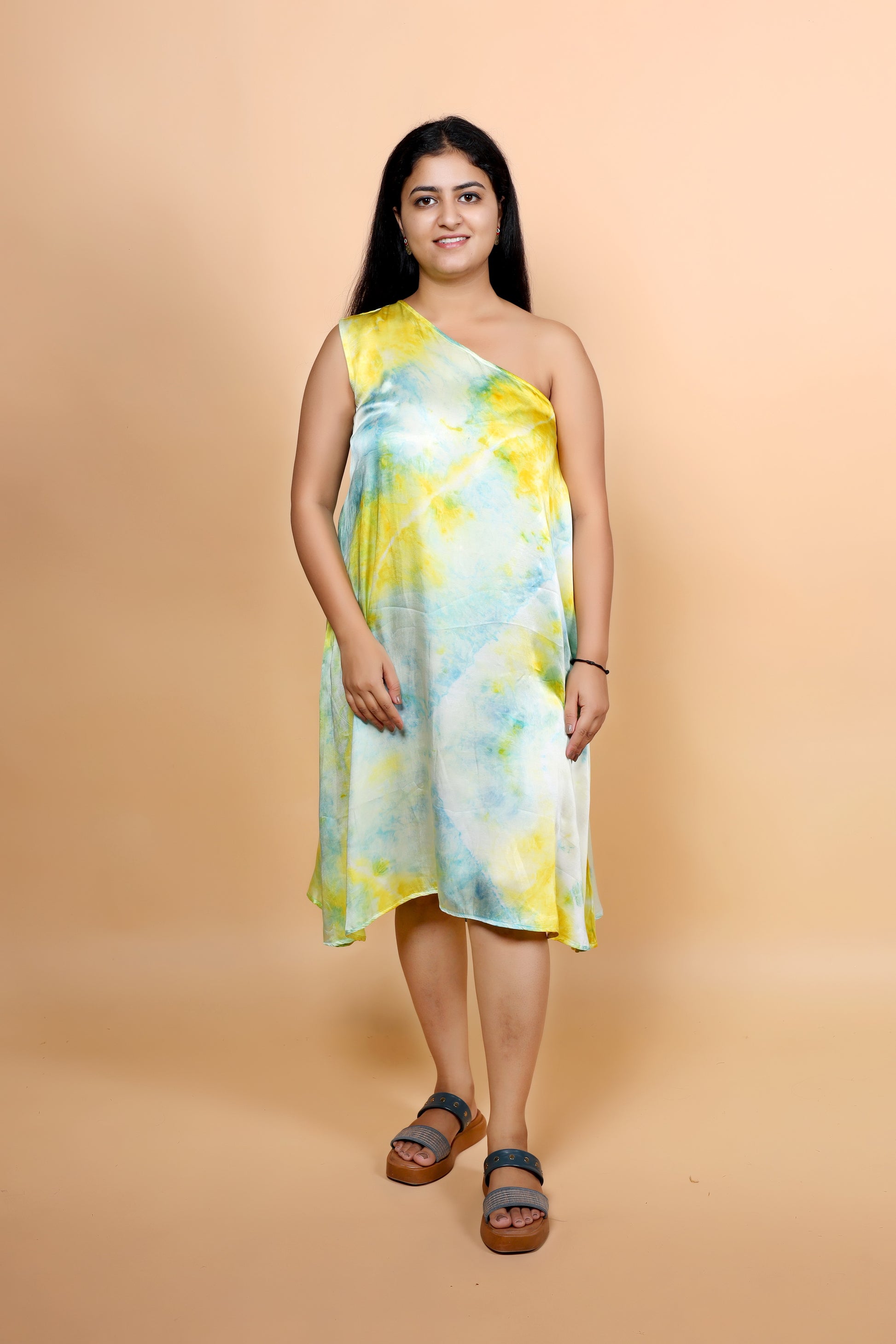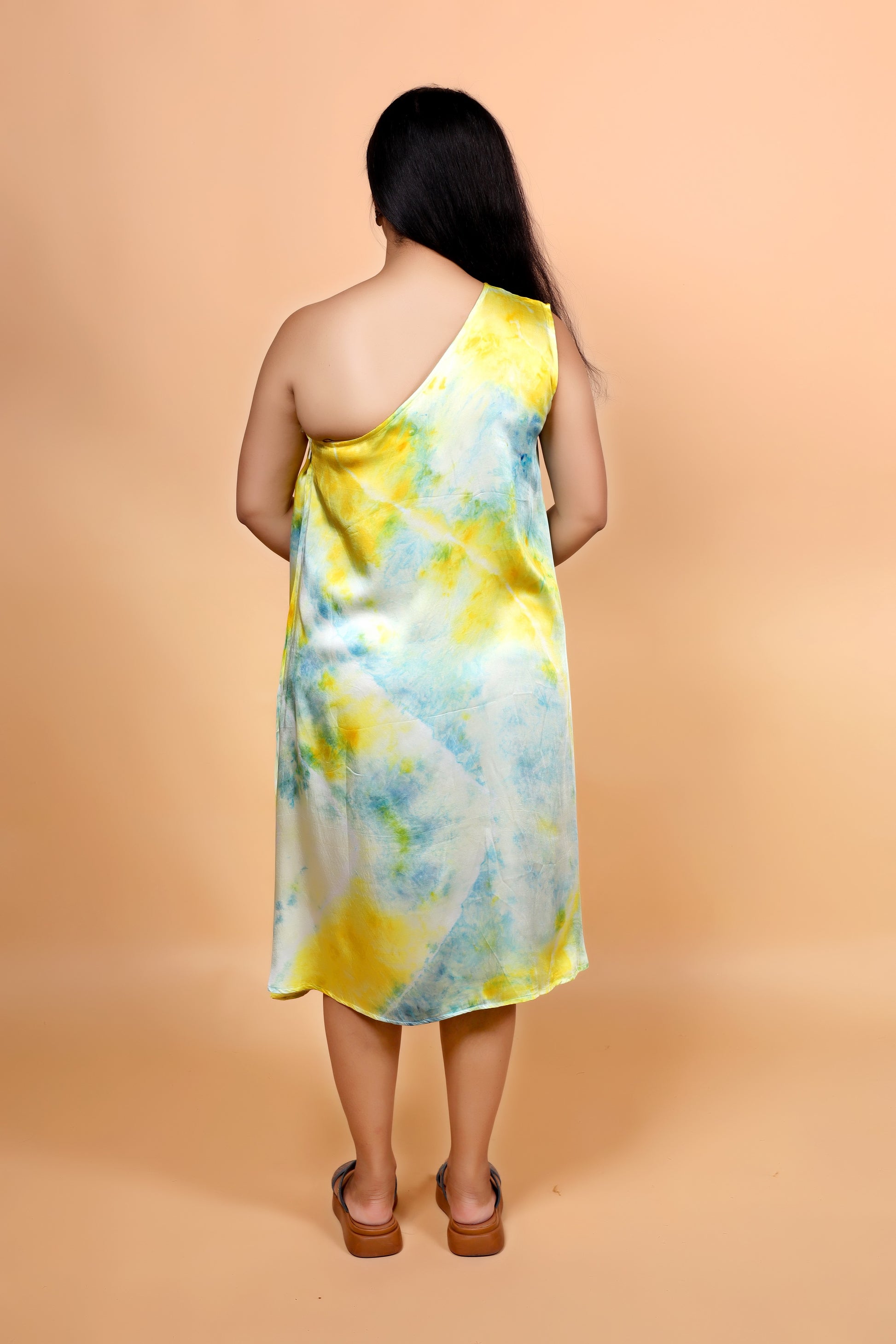 Bright, breezy, and effortlessly chic – this one-shoulder asymmetrical dress is hand-dyed with the ice dye technique, giving it a fresh and airy watercolor effect. The blend of sunshine yellow, soft aqua, and hints of green creates a light and playful look perfect for warm days.