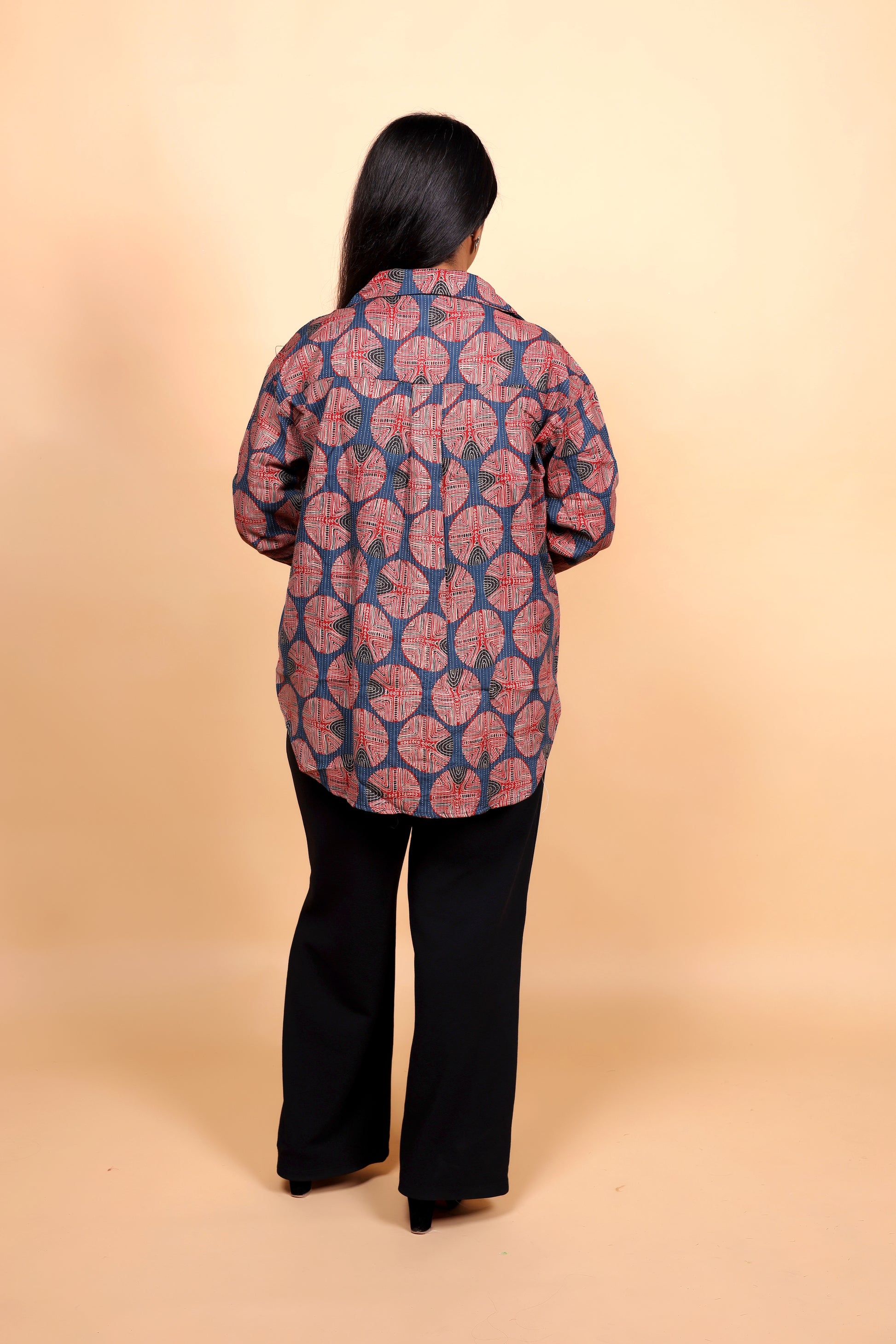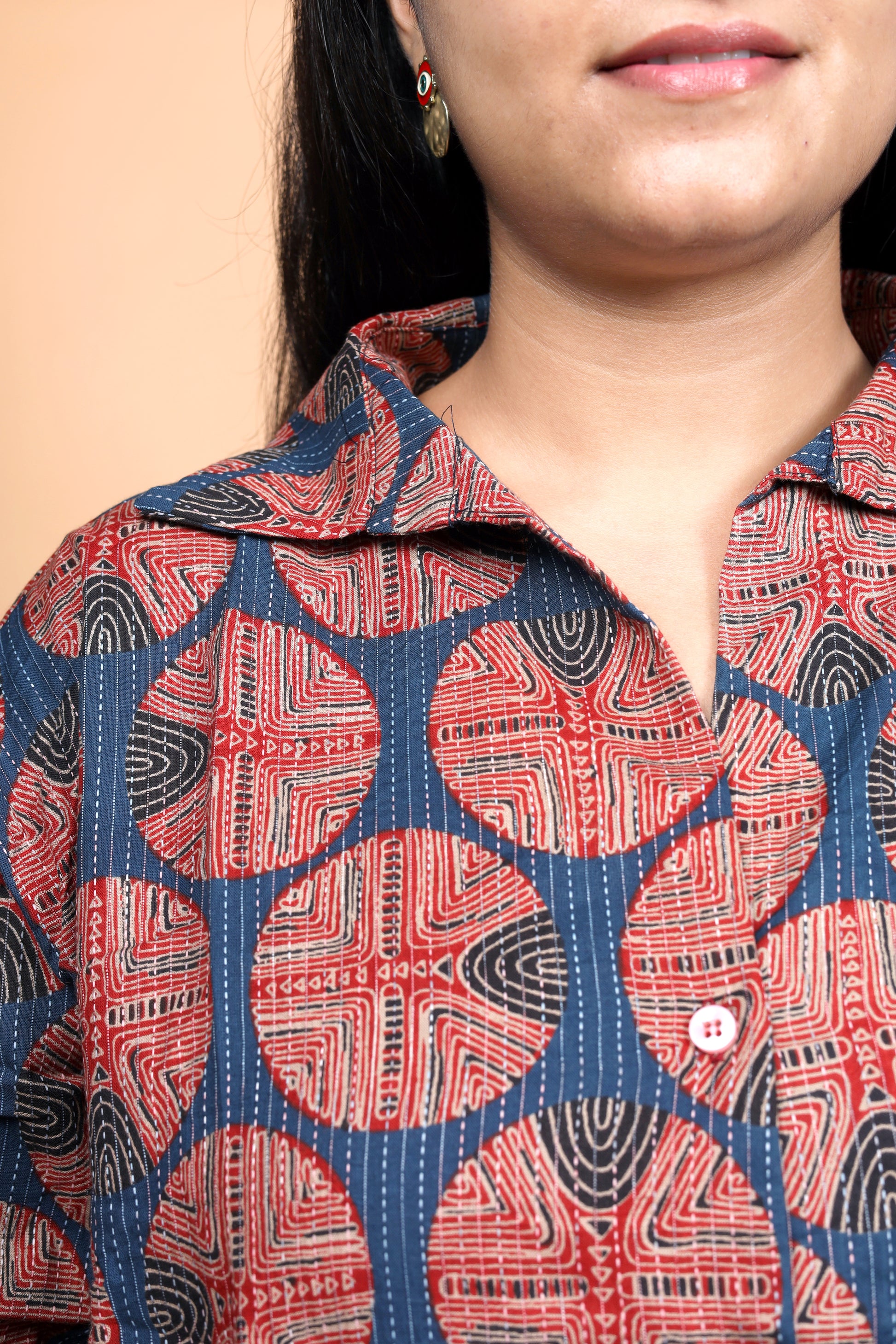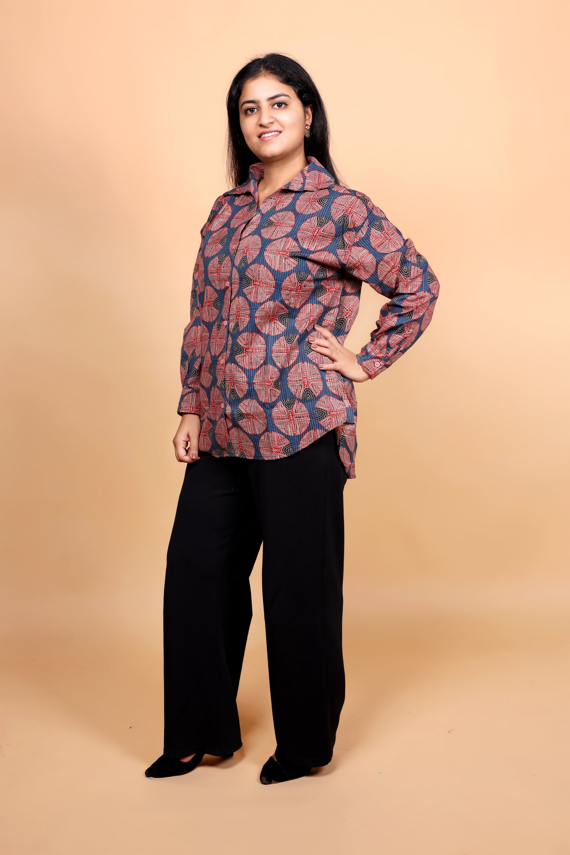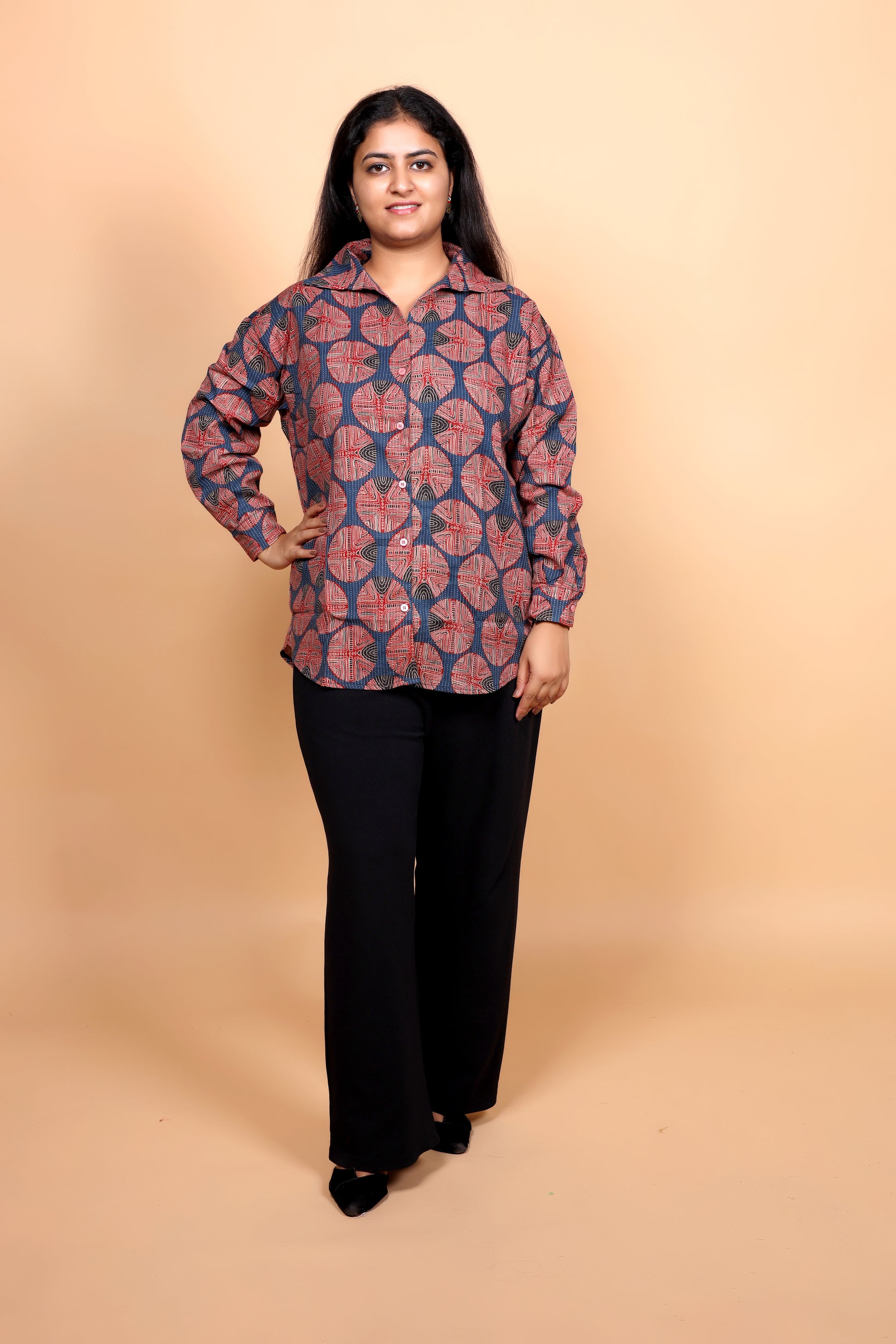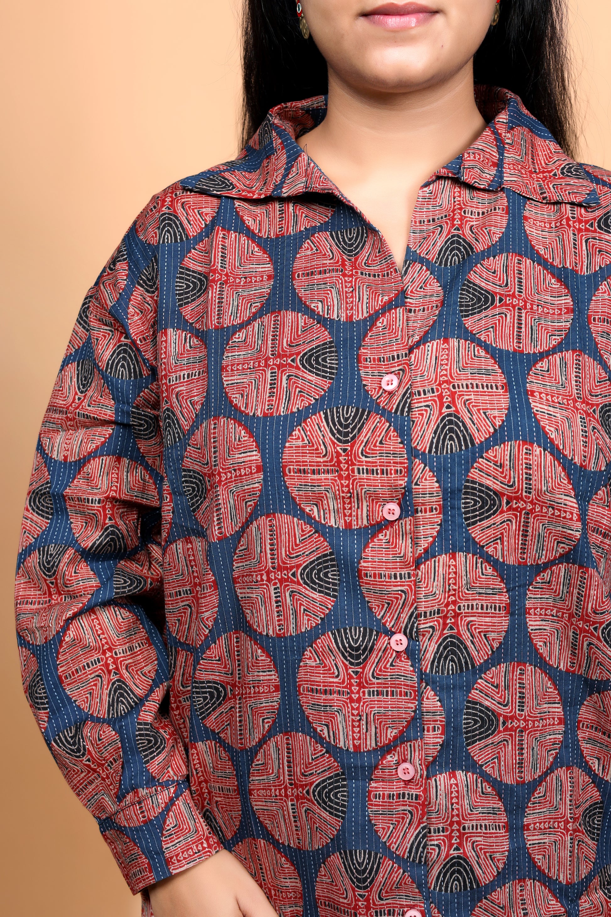 Make a bold statement with this handblock printed shirt, featuring an eye-catching geometric pattern in rust and indigo hues. The intricate circular motifs bring a touch of traditional craftsmanship, while the collared design and full sleeves add a modern silhouette. Perfect for casual outings or workwear with an artistic twist, this shirt blends heritage artistry with everyday versatility.