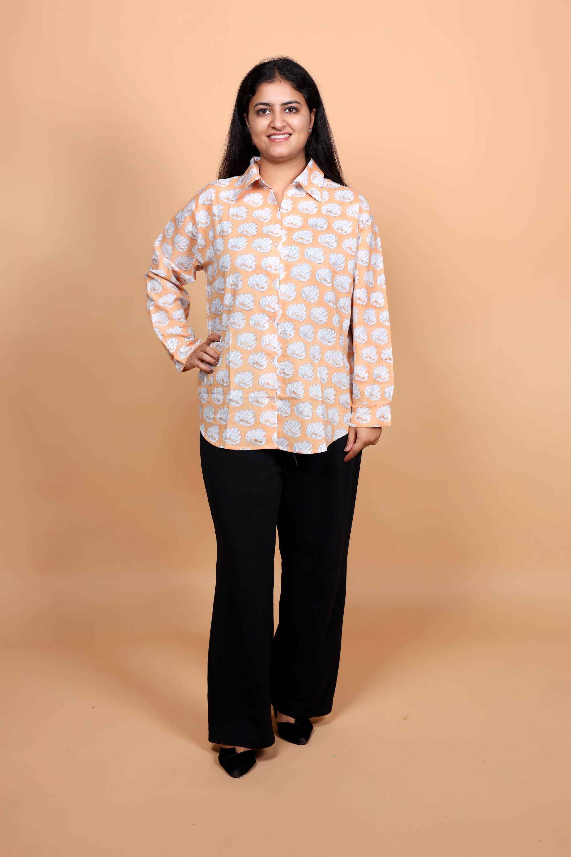 Bring a fresh touch of tradition to your wardrobe with this handblock printed shirt in soft peach tones. Adorned with delicate white floral motifs, it beautifully combines artisanal craftsmanship with modern elegance. The full-sleeve collared design and relaxed fit make it a versatile choice for casual outings, office wear, or festive gatherings. Effortlessly chic, this shirt is a celebration of timeless block printing on a contemporary silhouette.